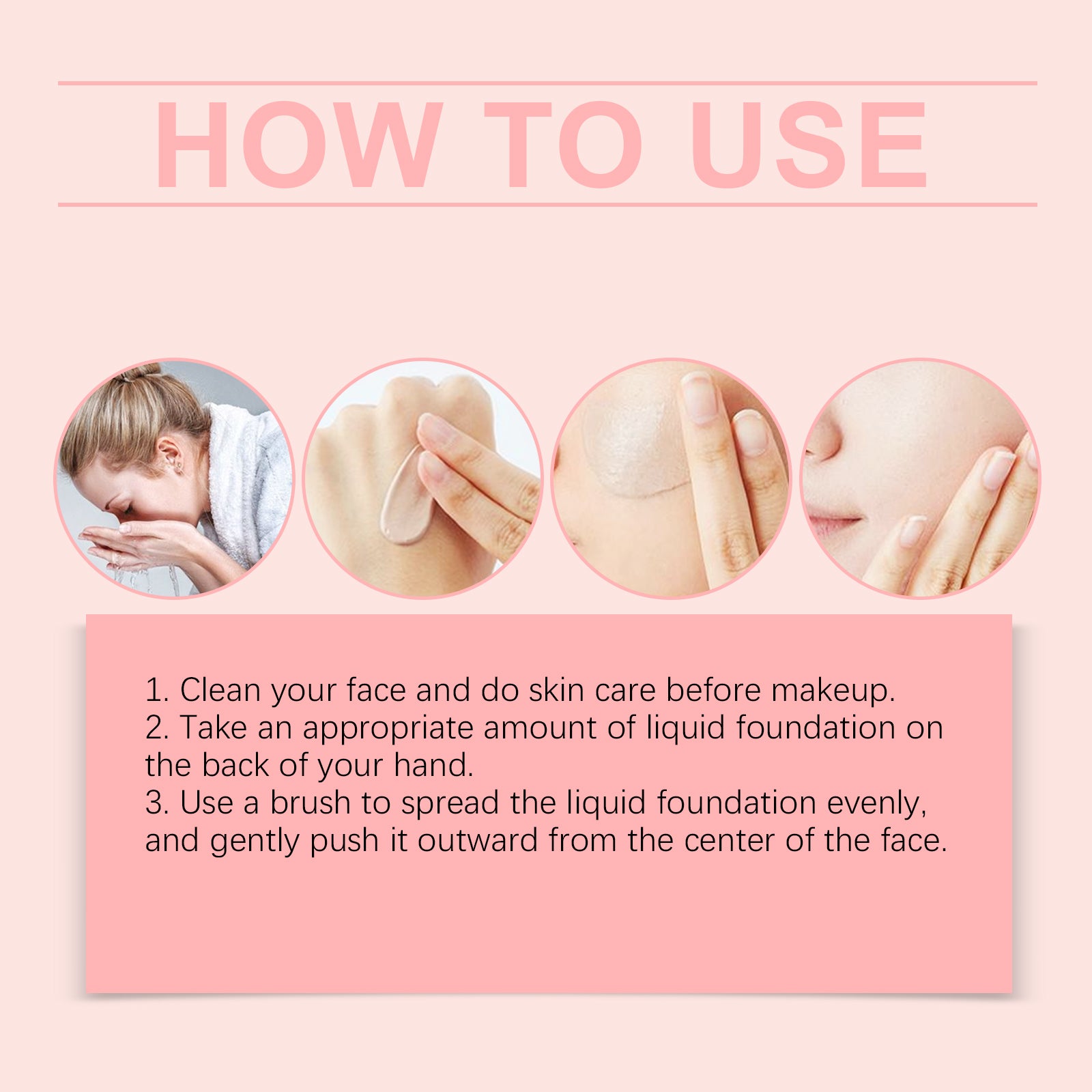 Our concealer foundation contains glycerin, aloe extract and vitamin C. It can deeply nourish the skin and retain moisture. The application method is very simple: 1. Clean your face and do skin care before applying makeup. 2. Take an appropriate amount of liquid foundation onto your palm. 3. Use a brush to evenly apply the foundation on your face, then gently spread it from the center of the face outward. The texture is light and thin, easily covering blemishes and creating a natural and flawless makeup look. It lasts all day without fading or dullness, making your skin glow.
