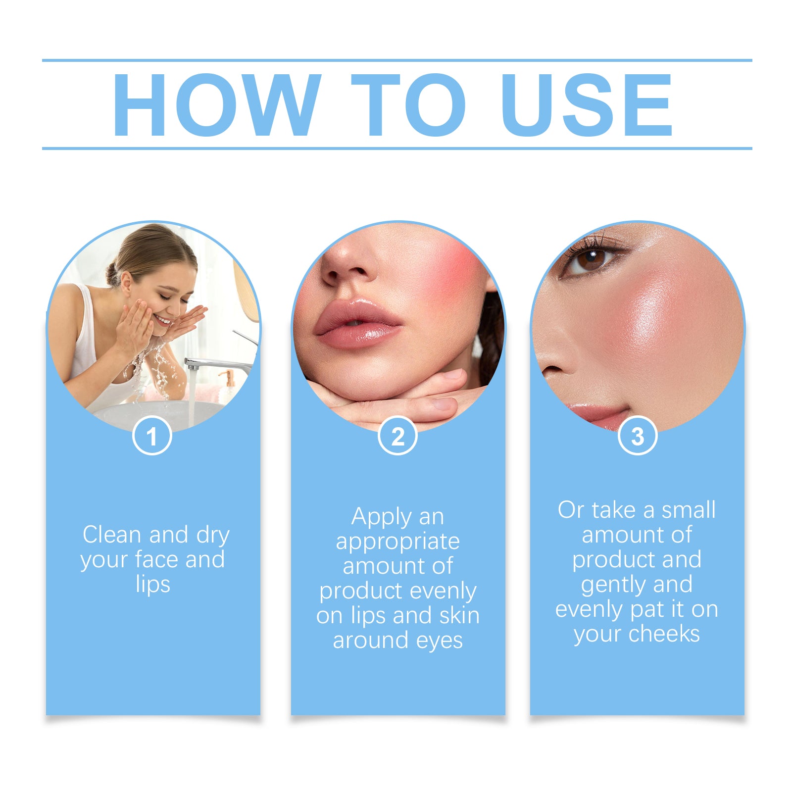 Our two-ended blush stick (with brush head) contains glycerin, titanium dioxide, sodium hyaluronate. It can create a high-end velvet texture with a single touch, while brightening the cheeks, eyes and lips. Unify the color of the whole face, brighten the skin tone, and give you a more perfect makeup. Its application method is simple: 1. Clean and dry the face and lips; 2. Apply an appropriate amount of the product evenly to the lips and the skin around the eyes; 3. Or take a small amount of product and pat it gently and evenly on your cheek. Long-lasting color. Show charm to suit different occasions. Moisturize, care for skin and improve skin softness.