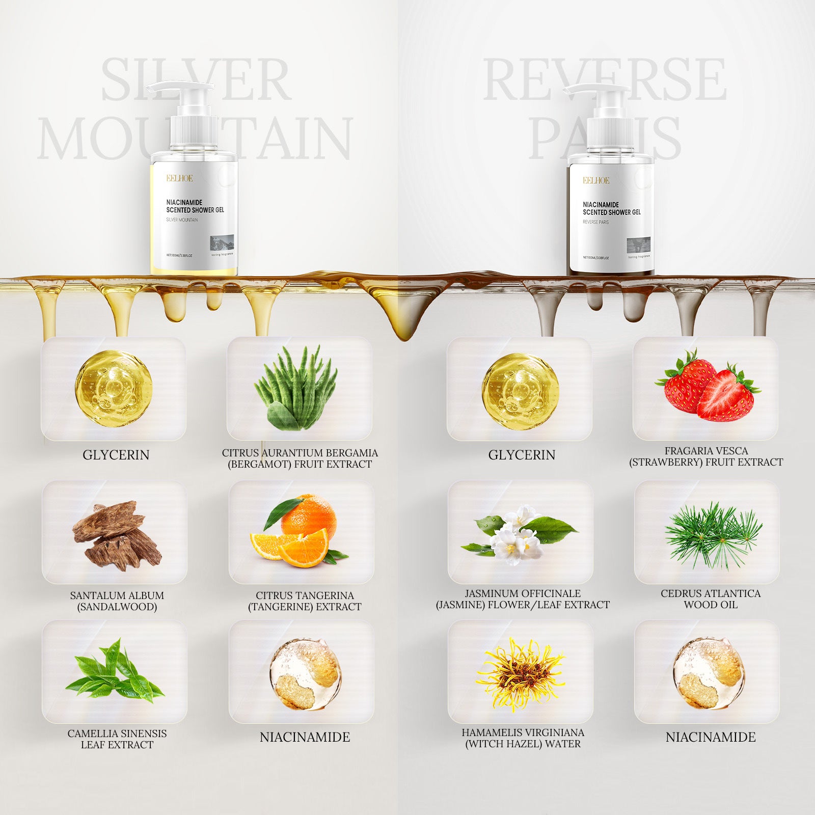 Our Niacinamide Scented Shower Gel contains Glycerin, Fragaria Vesca(Strawberry)Fruit Extract, Jasminum Officinale(Jasmine)Flower/Leaf Extract. It can improve dark and dull skin, make skin transparent and white after use, improve dry and rough skin, make it smooth and soft after use. Its use method is very simple: first clean the body with water, apply the right amount of body wash to produce foam and scrub, and finally rinse with water. Can improve clogged pores and provide deep cleansing.