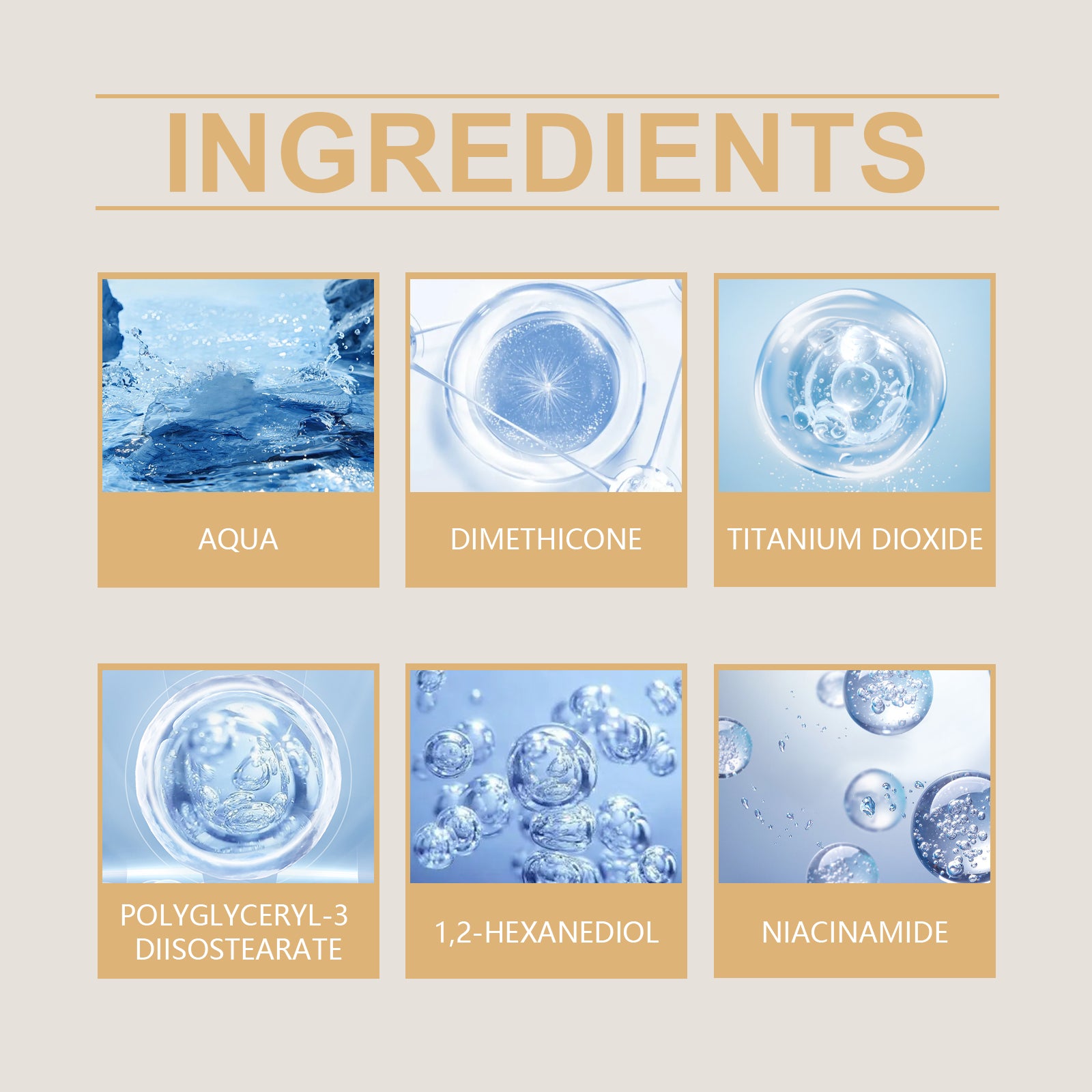 Our thermal concealer foundation contains 1, 2-hexanediol and niacinamide. It can effectively cover uneven skin tone and blemishes; Hyaluronic acid deep moisture, continuous comfort. Its use method is very simple: 1. After basic skin care, take appropriate amount of this product evenly spread on the face skin. 2. Gently pat with your fingers or a wet cotton pad to make the makeup more even and fit. Niacinamide and vitamin C work together for skin health.